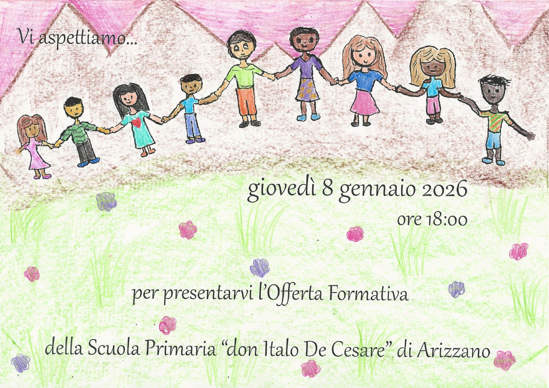La Scuola Primaria "don Italo De Cesare" di Arizzano vi aspetta l'8 gennaio 2026 alle ore 18.00 per la presentazione dell'offerta formativa.