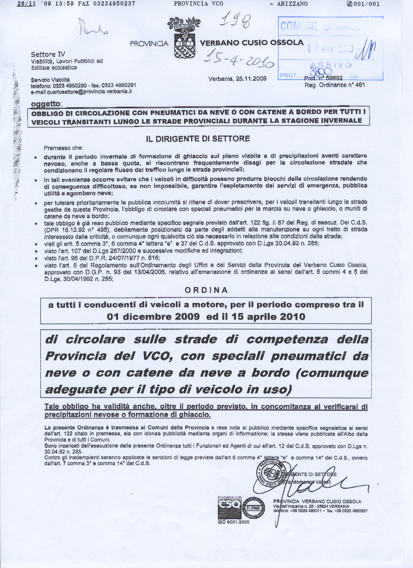 OBBLIGO DI CIRCOLAZIONE CON PNEUMATICI DA NEVE O CON CATENE A BORDO PER TUTTI I VEICOLI TRANSITANTI LUNGO LE STRADE PROVINCIALI DURANTE LA STAGIONE INVERNALE