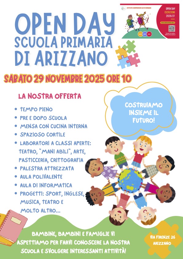 Siete tutti invitati all'Open Day della scuola Primaria di Arizzano che si terrà sabato 29 novembre 2025 alle ore 10.00.